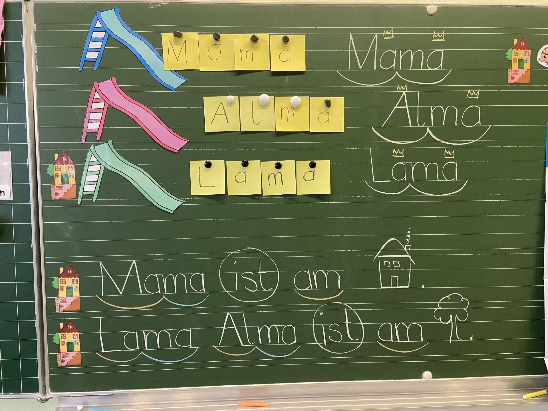 Mit Hilfe der Buchstabenrutschen lesen die Alpakas ganz fleißig ihre ersten Silben, Wörter und Sätze!