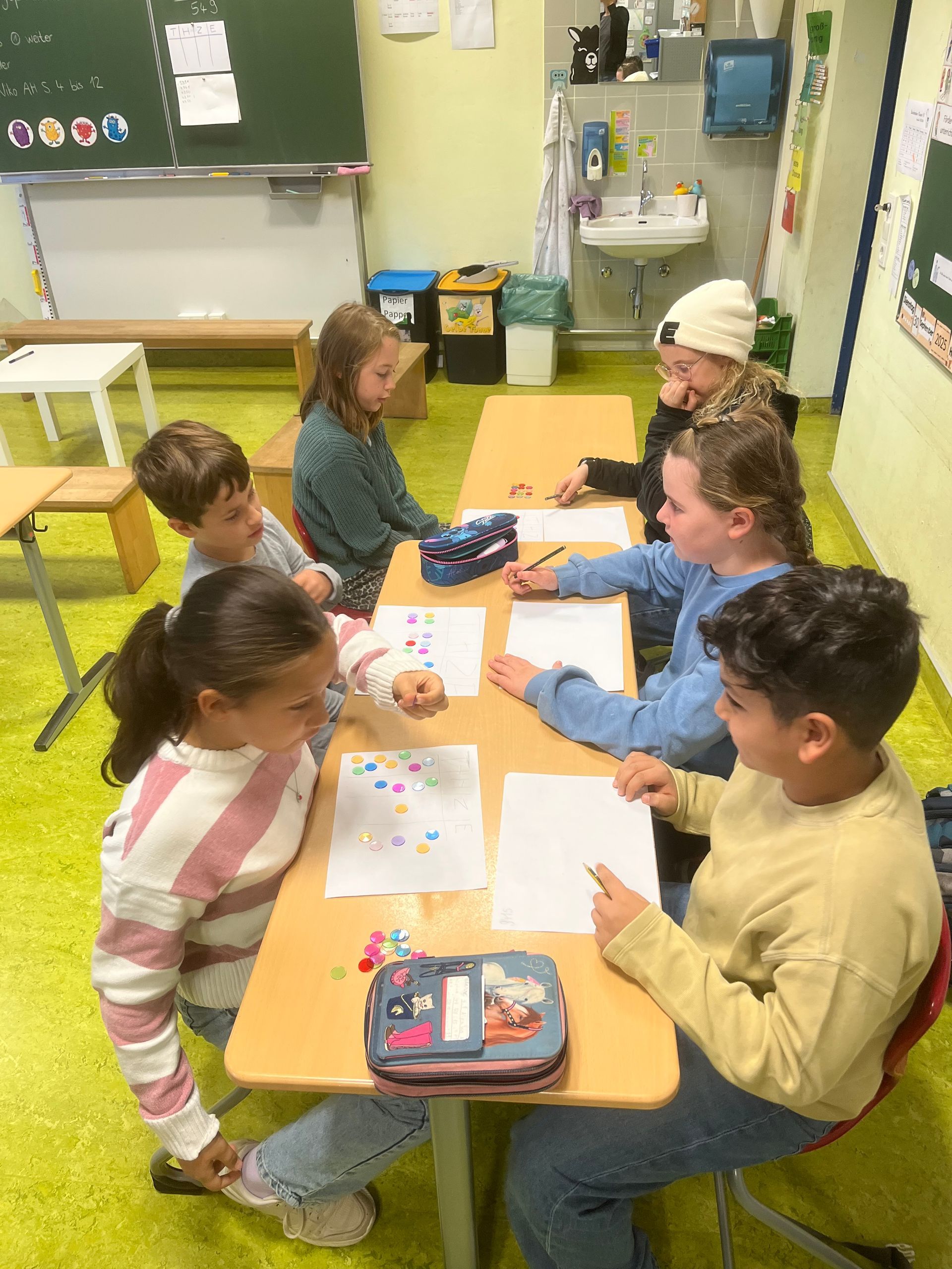 Einmal wurde die neue Zahl notiert, einmal die dazugehörige Rechenaufgabe. Nach kurzer Zeit wurde gewechselt und ein neues Kind durfte unsere gelegte Zahl verändern. Das war heute mal Matheunterricht der anderen Art!